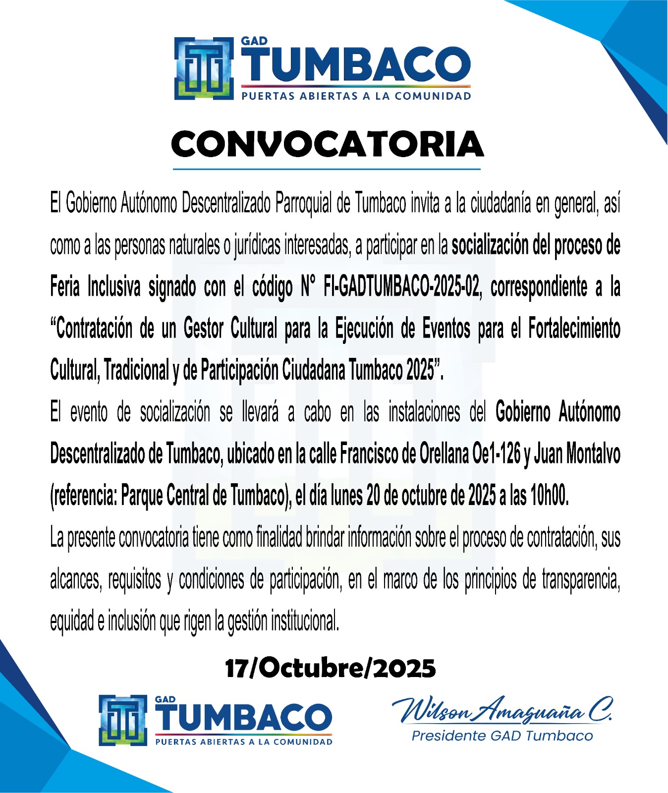 El Gobierno Parroquial de Tumbaco, realiza cursos y talleres gratuitos para el beneficio de la comunidad, enfocados en la necesidad de las personas, encaminados a un plan de acción para la distracción y sobre todo que se instruyan en la educación y conocimiento. Las actividades tienen lineamientos de buenas prácticas para el desempeño de cada persona.